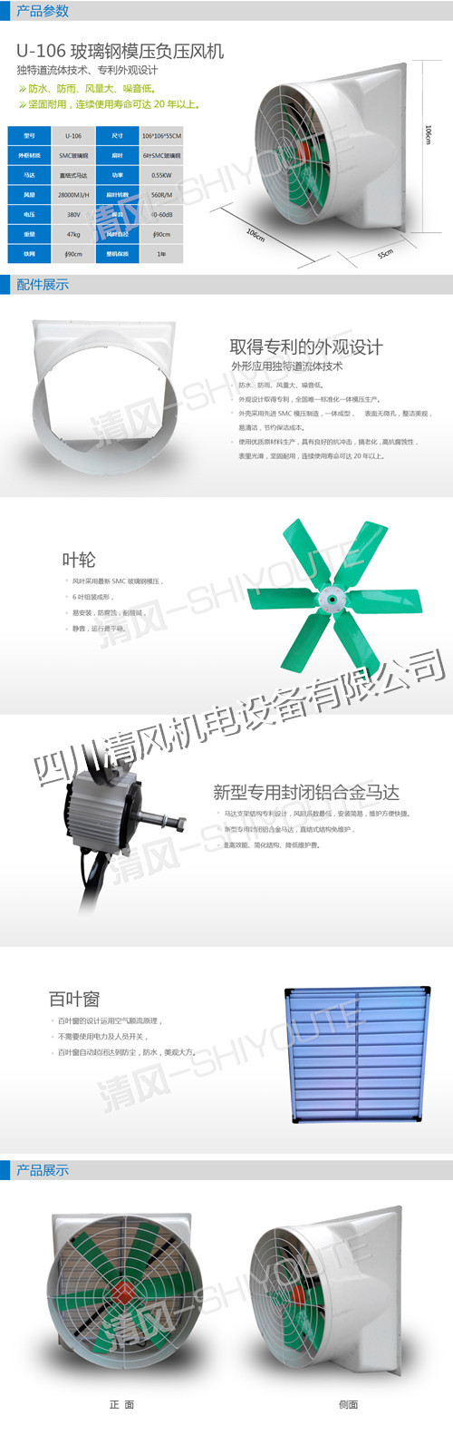※ 降温效果佳:外界空气经仕优特SMC模压玻璃钢负压风机抽风室内温度可达到5-10度的降温效果。