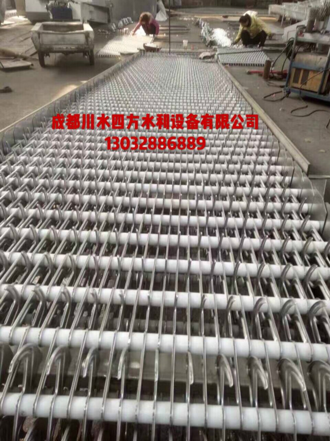 广汉清污机厂家-专业污水处理设备厂家清污机是由一种独特的耙齿厂装配成一组回转格栅链,在电机减速器的驱动下,耙齿链进行逆水流方向回转运动,当耙齿链运转到设备的上部时,由于槽轮和弯轨的导向,使每组耙齿之间产生相对自清运动,绝大部分固体靠重力落下,另一部分则依靠清扫器的反向运动把粘在耙齿上的杂物清扫干净。