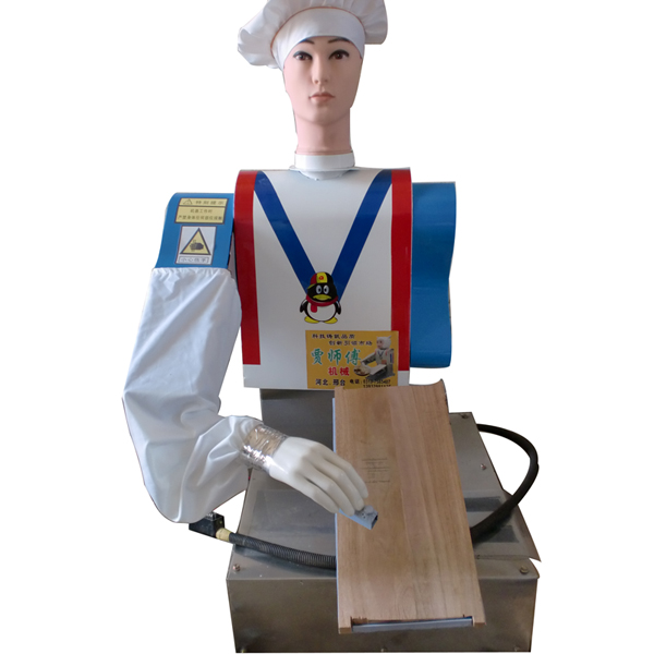 1、本机外壳采用不锈钢包装,具有整洁美观,使用寿命长,安全卫生等优点. 2、刀削面机使用机械的方式完美再现山西刀削面的制作精髓,并在此基础上解决了人工揉面、削面质量差异化的问题。刀削面机特有的二次揉面过程,使面筋纹路正好顺着刀削的方向形成,因此削出的面条口感要优于手工刀削面。 3、刀削面每分钟可削3-5斤面,不仅可以将刀削面师傅从繁重的体力劳动中彻底解放出来,而且应对每天的客流高峰期更是得心应手,从容不迫、顾客的满意度将大幅度提高。 4、使用方便。刀削面机削出的面条宽窄、薄厚可以随意调整,满足不同顾客需求。 5、刀削面机削出的面条形状美观,中厚边薄,棱风分明,长短均匀,入口筋道滑爽,耐煮耐搁软而不粘,越嚼越香,美味诱人。 机器人刀削面机 6、刀削面机不吃不喝,节省费用,可以轻松实现厨房的标准化和机械化作业,大幅降低管理成本,提高工作效率和工作质量。减轻管理者的工作压力。降低厨房的成本支出,一次投入,让您省心、放心、安心!