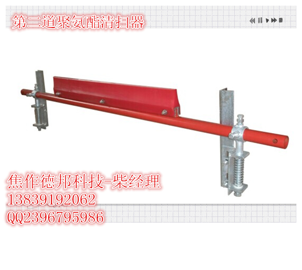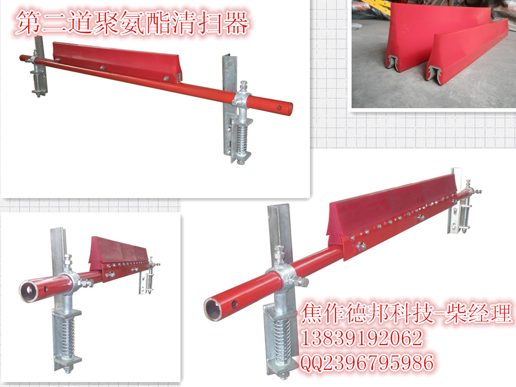 DB-PPU系列第二道聚氨酯清扫器(普通型)安装在头部滚筒下部回程输送带平直工作面处。与DB-HPU第一道清扫器配合使用,弹簧的压力能自动补偿因刮刀与皮带磨损产生的间隙,保持刮刀与输送带紧密接触,刮除输送带粘料效果佳,且不损伤皮带。