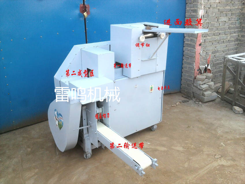 工作原理:经揉面机揉压后的面皮折成该要所需宽度经入面簸箕,顺序喂入轧辊,揉压后经输送带,自动进入折弯,成型和切割部分,切割后经第二条输送带顺序送出.
