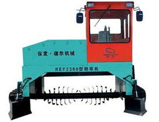 自走式翻堆机(自行式翻堆机)是生产生物有机肥专用成套设备中的主机,该机采取四轮行走设计,可前进、倒退、转弯,由一人操控驾驶。行驶中整车骑跨在予先堆置的长条形肥基上,由机架下挂装的旋转刀轴对肥基原料实施翻拌、蓬松、移堆,车过之后篡成新的条形垛堆。即可在开阔场地,也可在车间大棚中实施作业。该机一大技术突破在于整合了物料发酵后期的破碎功能。随着物料逐渐脱水,加装破碎装置的刀轴可有效地破碎肥料在发酵过程中形成的板块,不仅省去了一台粉碎机,更主要的大大提高了粉碎的效率,降低了成本,从根本上解决了生产量受粉碎机制约的问题。