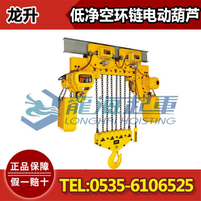 低净空环链电动葫芦(超低环链电动葫芦、超低净空环链葫芦),是烟台开发区龙海起重工具有限公司特别针对,有限狭小的提升空间设计的环链电动葫芦,适用于空间狭小的场合,特别是临时搭建的厂房,工长、工地、机械车间等。设有双刹车,安全可靠,散热效果好,下吊钩可360度旋转。
