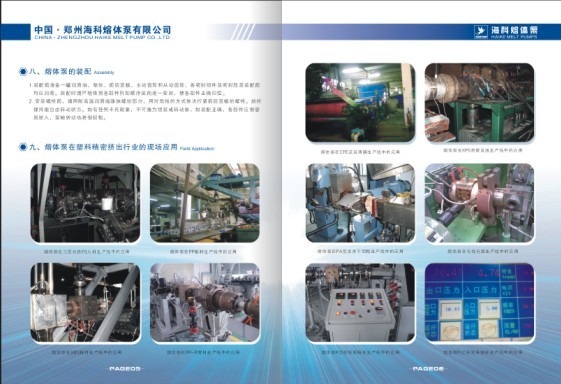 熔体泵采用独特的容积式设计, 适用于高温高粘度聚合物熔体的输送、增压、计量,使其可不受压力、温度、和粘度这些条件变化的影响。泵提供挤出机和模具间的压力,并可匹配挤出机的参数,在输出量增加和公差要求严格的情况下提供均匀的熔体。一般安装于挤出机出口与机头之间,在造粒、薄膜、管材、板材、片材等聚合物挤出成型中得到广泛应用,也可以安装于管路中用来输送高粘度纯净物料。