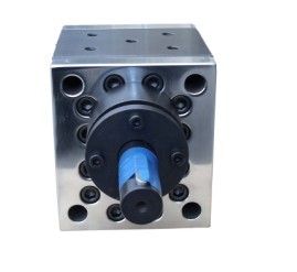 熔体齿轮泵由泵壳、前后侧盖、齿轮轴、滑动轴承和轴封构成。熔体齿轮泵属于正位移泵,工作时依靠主、从动齿轮的相互啮合造成的工作容积变化来输送熔体。工作容积由泵体、齿轮的齿槽及具有侧板功能的轴承构成。 当齿轮旋转时,熔体即进入吸入腔两齿轮的齿槽中,随着齿轮转动,熔体从两侧被带入排出腔,齿轮的再度啮合,使齿槽中的熔体被挤出排出腔,压送到出口管道。只要泵轴转动,齿轮就向出口侧压送熔体,因此泵出口可达到很高的压力,而流量与排出压力基本无关。