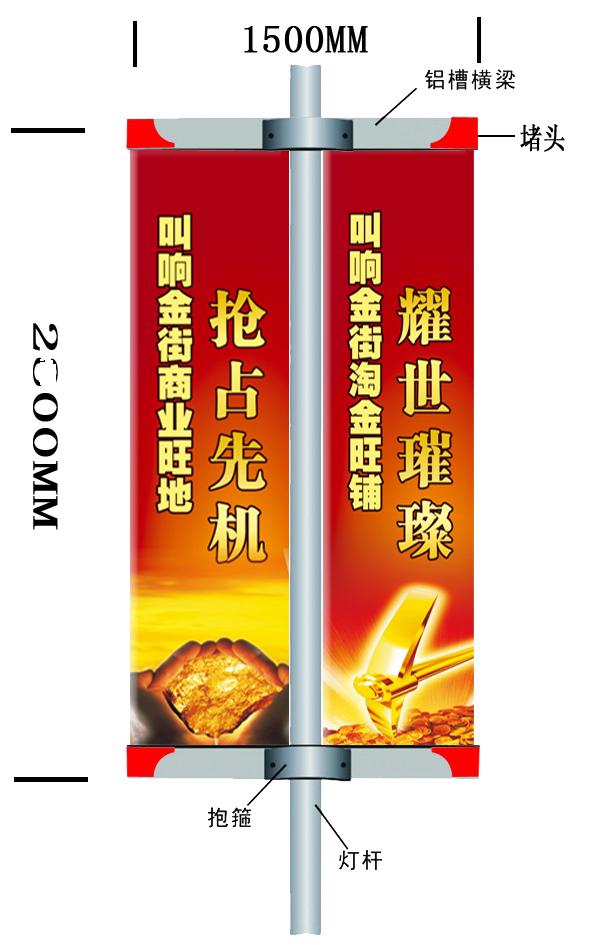 铝合金道旗架,又被称之为路灯旗杆、灯杆幕旗、路灯杆道旗等。一般是指安置于道路两侧、活动场馆附近的路灯灯杆等物体上的广告、宣传媒体。属于户外广告媒体的一种。