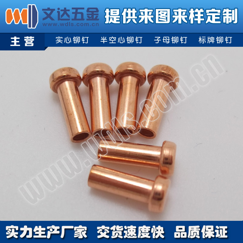 深圳市文达五金制品有限公司厚平头半空心铜铆钉,半空心铆钉,紫铜铆钉,紫铜铆钉厂家供应,是一家专业生产和经营铜、铁、铝、不锈钢等各种材质的铆钉(平头铆钉、圆头铆钉、大扁头铆钉、实心铆钉、半空心铆钉、空心铆钉、台阶铆钉、子母铆钉)、螺丝及其他五金件产品的企业,产品广泛应用于五金类产品、玩具、家具、家电、健身器材、电子电器产品、通讯设备、汽车制造等多种生产制造领域。为满足不同客户的需求,可根据客户提供的图纸或样品加工。