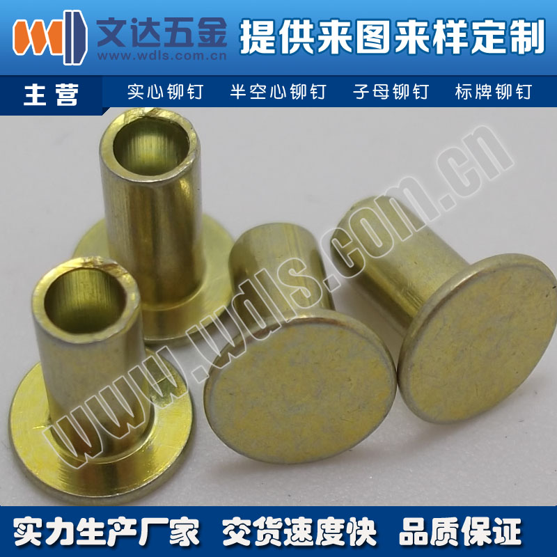 深圳市文达五金制品有限公司供应铁铆钉,铁镀黄锌半空心铆钉,半圆头铁镀黄锌铆钉,主营铆钉生产,主要设备是高速冷锻打头机,是一家主要生产各种材质(不锈钢、铜、铝、铝合金、铁等)的铆钉(中空铆钉,实心铆钉、半圆头铆钉、平头铆钉、沉头铆钉、子母钉等)的厂家。公司拥有先进的机械设备及经验丰富的技术骨干,可生产产品尺寸为公称直径: 1.0mm ~ 6.0mm,长度: 1.5mm ~ 60mm,帽径: 1.5mm~ 15mm。制造的产品畅销国内外,产品质优价廉,起货快捷,服务专业到位,深得广大新老客户的一致好评。本公司一直秉承“诚信卓越专业共享”的核心价值观和“合规稳健,创新发展”的经营理念,服务优质、效益良好、创新能力和市场竞争能力突出。我们以开拓进取、敬业创新为精神,热忱欢迎国内外新老客户洽谈合作,共铸辉煌。
