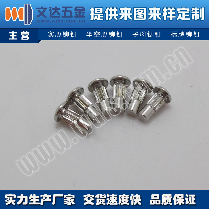 深圳市文达五金制品有限公司,主营铆钉生产,主要设备是高速冷锻打头机,是一家主要生产各种材质(不锈钢、铜、铝、铝合金、铁等)的铆钉(中空铆钉,实心铆钉、半圆头铆钉、平头铆钉、沉头铆钉、子母钉等)的厂家。公司拥有先进的机械设备及经验丰富的技术骨干,可生产产品尺寸为公称直径: 1.0mm ~ 6.0mm,长度: 1.5mm ~ 60mm,帽径: 1.5mm~ 15mm。制造的产品畅销国内外,产品质优价廉,起货快捷,服务专业到位,深得广大新老客户的一致好评。本公司一直秉承“诚信卓越专业共享”的核心价值观和“合规稳健,创新发展”的经营理念,服务优质、效益良好、创新能力和市场竞争能力突出。我们以开拓进取、敬业创新为精神,热忱欢迎国内外新老客户洽谈合作,共铸辉煌。