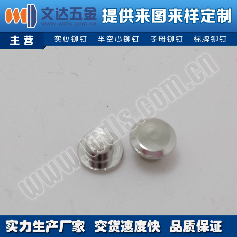深圳市文达五金制品有限公司,主营铆钉生产,主要设备是高速冷锻打头机,是一家主要生产各种材质(不锈钢、铜、铝、铝合金、铁等)的铆钉(中空铆钉,实心铆钉、半圆头铆钉、平头铆钉、沉头铆钉、子母钉等)的厂家。公司拥有先进的机械设备及经验丰富的技术骨干,可生产产品尺寸为公称直径: 1.0mm ~ 6.0mm,长度: 1.5mm ~ 60mm,帽径: 1.5mm~ 15mm。制造的产品畅销国内外,产品质优价廉,起货快捷,服务专业到位,深得广大新老客户的一致好评。本公司一直秉承“诚信卓越专业共享”的核心价值观和“合规稳健,创新发展”的经营理念,服务优质、效益良好、创新能力和市场竞争能力突出。我们以开拓进取、敬业创新为精神,热忱欢迎国内外新老客户洽谈合作,共铸辉煌。