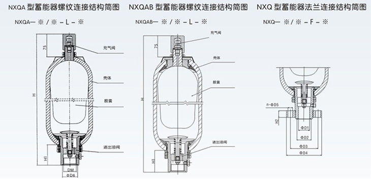 NXQ系列国标囊式蓄能器是朝日液压公司生产的结构形式为胶囊式的蓄能器,由于其在储蓄能量,稳定压力,减少能耗,补偿漏损等方面具有出色的特点,因此在被广泛使用于汽车、机械机床、石油、航天航空等行业领域。