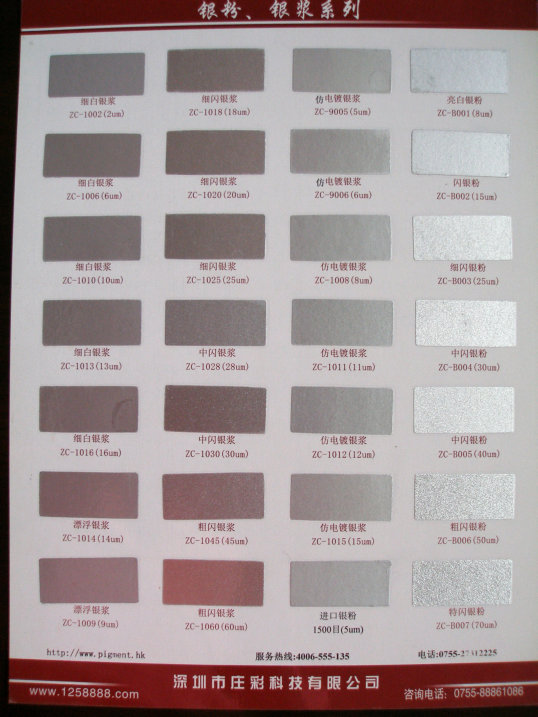 深圳市庄彩铝银浆颜料有限公司  13378662095  QQ  1041684813庄彩  银粉系列,细白银粉,丝光银浆,幼小银浆,闪光银浆,亮白银粉,细闪银粉,中闪银粉,粗闪银粉,特闪银粉  德国爱卡银粉  德国进口银粉,庄彩银浆系列,细白银浆  亮白银浆  亮白银浆  仿电镀银浆  电镀银浆,闪银浆  漂浮银浆  烫金银浆  仿烫银浆  爱卡银浆212,爱卡铝银浆301德国爱卡银浆214  水性铝银浆,水性细白铝银浆,水性仿电镀铝银浆,水性闪银浆,水性铝银粉公司产品通过多项检测标准  SGS    PAHS    ROHS多项检测标准  无铅无毒  环保    主要生产铝银浆铝银粉、铝银浆具有耐高温,耐酸碱,金属效果显著,质量稳定,库存量大,供货周期短,产品包括细白银浆(粒径有5um-14um)、闪光银浆(粒径有18um-80um)、仿电镀银浆(粒径有2um-13um)、水性银浆(粒径有5um-60um)400目铝银粉、800目铝银粉、1000目铝银粉、1200目铝银粉、1500目铝银粉等系列产品。广泛用于包装彩印、印染、织物印银、涂料、油漆油墨、印刷,丝印,印染,工艺品,塑胶,硅胶,纸业、氟碳漆、塑胶、皮革等各种行业。