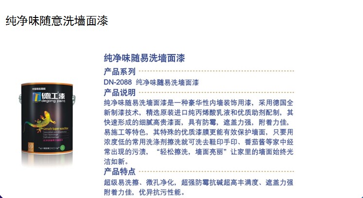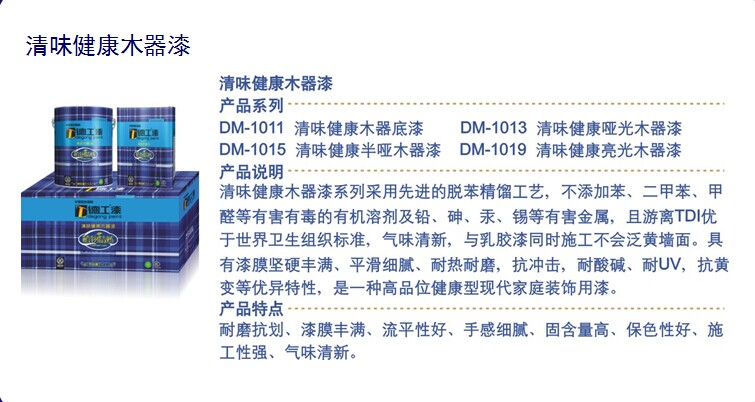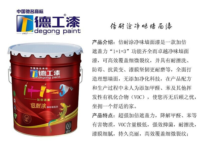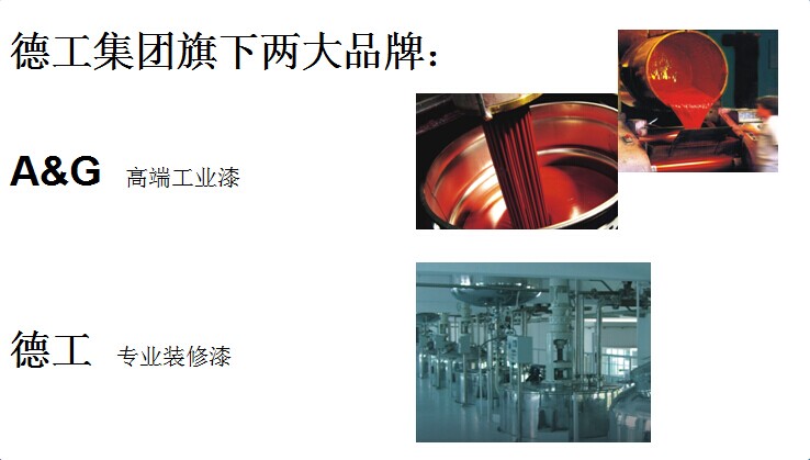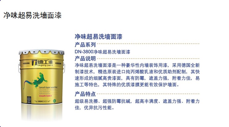 德工漆产品体系:建筑涂料,内外墙涂料,乳胶漆,家具漆,木器漆,防水涂料,氟碳漆,艺术涂料,多彩花岗岩涂料,真石漆,刮沙漆,罩光清漆,环氧地坪漆,工业漆,装修辅材等。