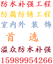 1、防水补漏:建筑楼面裂缝、伸缩缝、高低沉降缝、女儿墙防水补漏、铝合金框、高空外墙幕墙防水补漏、给排水管防水补漏,铁皮瓦房 、阳光板房、水槽等漏水渗水防水补漏,卫生间、水池、水塔、水箱、桥梁、路面、地下室、地下管沟、隧道等防水补漏补强及灌浆止水加 固。