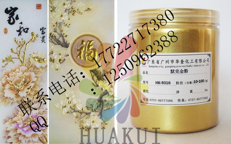 广州华奎金箔粉由新型合成高透明度片状晶体底材,包覆二氧化钛等金属氧化物组成,通过精密控制二氧化钛等金属氧化物的包覆厚度,产生黄金颜色一样的效果。特殊钻石珑光泽效果颜料赋予一个全新的、璀璨的、星光闪烁的、钻石般的光学维度空间及美妙的色调,这些富于情感的色彩及光泽,使终端产品的美丽、个性及品质得以充分的展示。