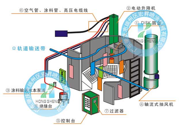 Ω圆盘型DISK自动涂装机按台产标准生产,雾化器采用台产S7系列,扭力强,噪音小,动力平衡稳定(空转速可达60000rpm),涂料颗粒雾化细腻,上漆率高;静电装置采用台制高压静电发生器,运行稳定,连续工作寿命长;涂料供给采用变频控制系统,油量数字化可调,涂料吐出量稳定、均匀;涂料管采用进口铁氟龙防爆涂料管;升降机系统采用东元低噪声1HP变速马达,台达变频控制,运行平稳;低压电气元件采用韩国LG和台湾天得品牌,程序控制元件采用日本三菱品牌;中央控制系统采用德国西门子7英寸触摸式人机界面、四~七段式可调(可根据客户要求设计),段速5-60HZ变频可调。该设备在喷涂效果和各方面性能及环保指标等都得到各个行业喷涂厂家的认可及肯定。已广泛应用于五金金属、自行车、木器、乐器、摩托车、汽车配件等各行业。