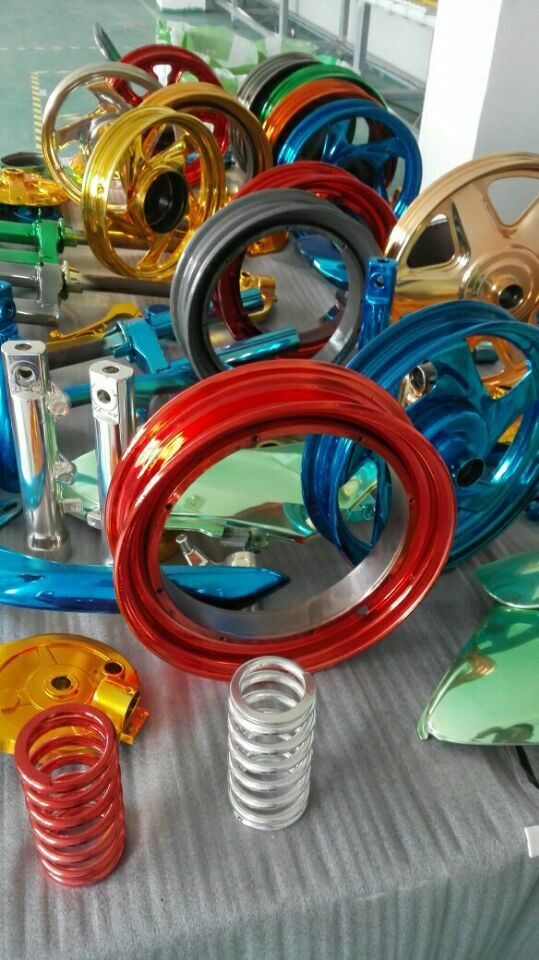 纳米喷镀技术喷镀的产品既可单纯喷涂铬面效果,也可以喷涂其他各种颜色,如:金黄色、黄铜色、仿古金黄、炮铜色、(红黄紫绿蓝)等各种镜面高光效果,各种颜色可以随心所欲。