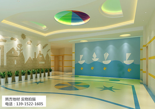 装饰性强:地板设计在幼儿园环境设计中是相当重要的环节。幼儿从第一步迈进园区,最先吸引他们注意力的是色彩,其次是图像,最后才是文字。幼儿正处在身体、智力形成以及迅速发展的重要时期。因此,腾方PVC塑胶地板根据幼儿对色彩的想象与联想及心理感受,通过地板色彩和图案设计,给幼儿一个健康、快乐、积极向上的空间环境。