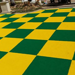 1、室外运动地板表面采用菱形落空面设计结构,耐冲击性聚丙烯材料,悬浮式共聚物模块,有多个支撑脚。模块之间采用搭接扣连接,可以提供水平机械缓冲性能。