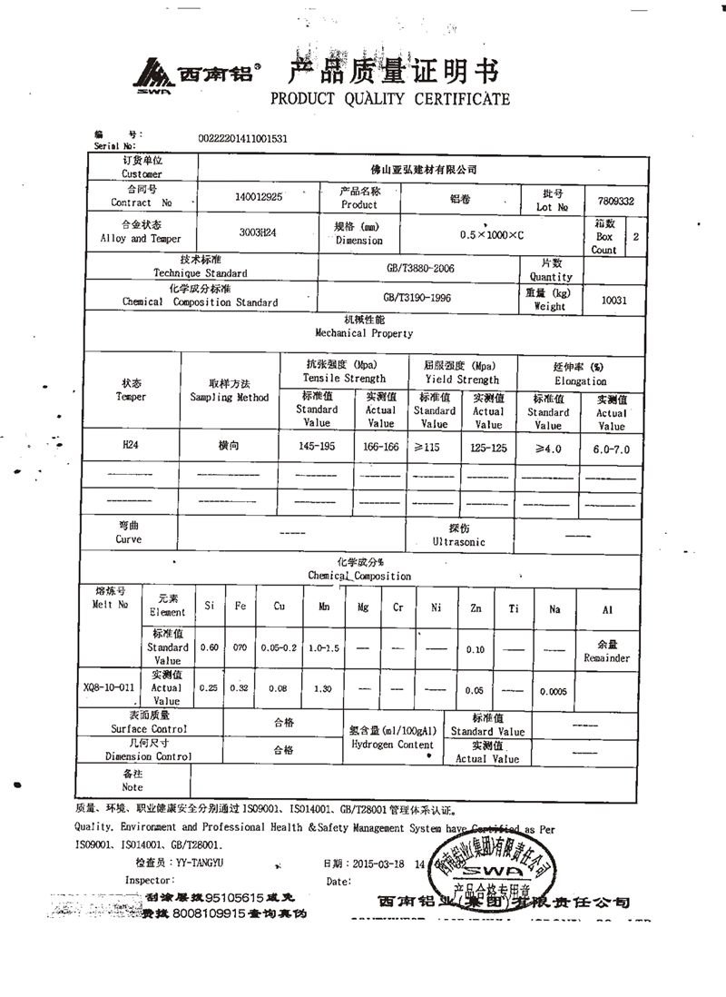 5052材质彩铝板抗拉、屈服强度和延伸率高,其抗氧化腐蚀性能很强。