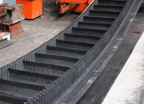 青岛川泽翔大倾角波状挡边带由基带、挡边、横隔板3部分组成。挡边起防止物料测滑撒落的作用。为便于绕过滚筒,挡边设计成波纹状;横隔板的作用是承托物料,为了实现大倾角输送,采用T型TC型。档边和横隔板是用二次硫化的方法与基带连接的,具有很高的连接强度
