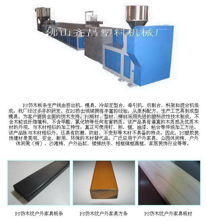 PS仿木板生产线,PS生产线、PS型材生产线、PS挤出生产线、PS机组、PS异型材机械、PS塑料挤出机、PS发泡设备、PS发泡挤出机组。由挤出机,模具,冷却定型台,牵引机,切断机,堆放架组成。