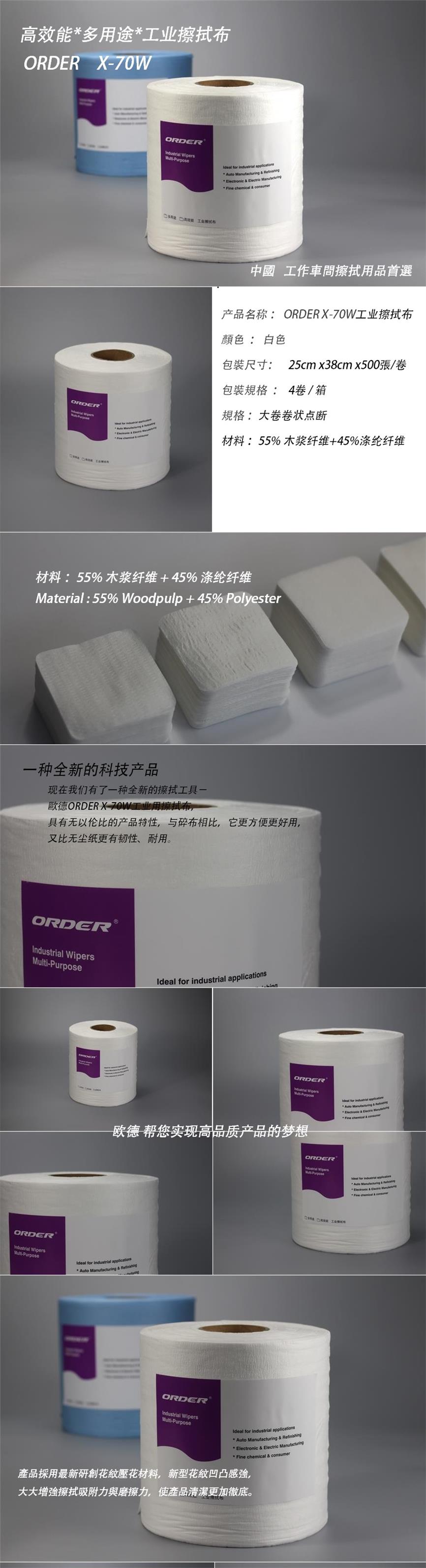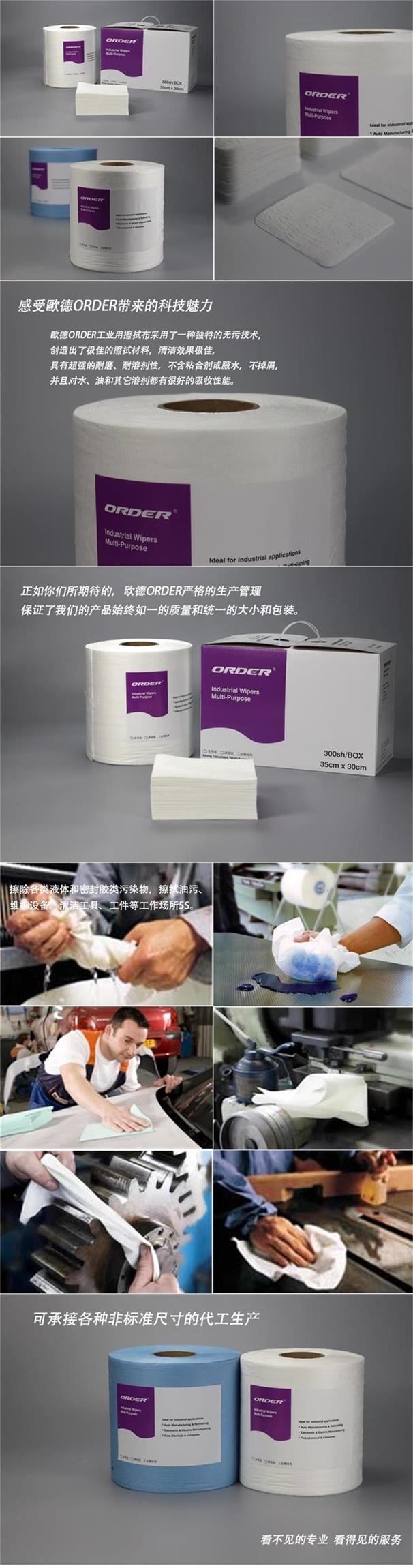 蓝色/白色大卷工业擦拭布采用了一种独特的无污技术,使用天然木浆和聚脂纤维为原料,经独特的水刺法加工而成,形成特有的木浆/聚脂双层结构,强韧耐用,具有高效吸水吸油性,柔软,不掉尘,防静电之性能。创造了极佳的擦拭材料,清洁效果极佳,对水、油和其它溶剂都有很好的吸收性能、能迅速吸收水、油污及其它液体,提高劳动效率。该产品具有抗拉强力好,表面不掉屑,手感柔软,吸收速度快,吸收倍数高等多项优越的性能,其擦拭性能位于同类前列;