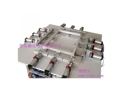 1、 采用压缩空气气源,驱动多个汽缸活塞,同步推动紧网夹作纵横方向的相对收缩运动,对丝网产生均匀一致的拉力。