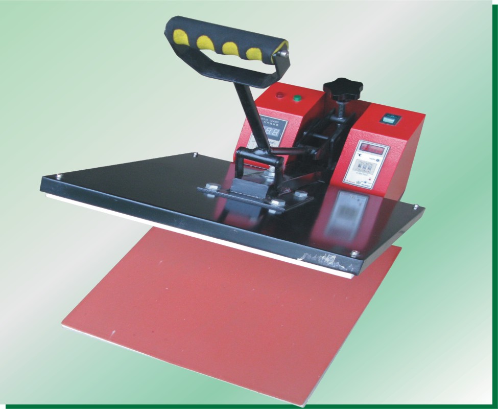 操作流程: ● 启动电源开关,电源指示灯指示; ● 合上压力手柄(调整压力适中); ● 将温控器调至所需温度,温度达到设定值时指示灯熄灭,即可以开始工作; ● 将定时器调至所需时间; ● 将转印东西放在下烫板上,再放上烫画纸(请注意烫画纸的正反面),将手柄向下压直至终点;烫印时间控制时间到时,蜂鸣器响,即将手柄向上提起至原位。