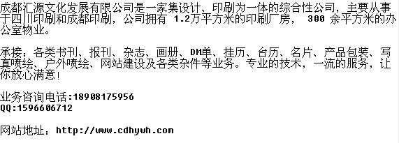 成都汇源文化发展有限公司是一家集设计、印刷为一体的综合性公司,主要从事