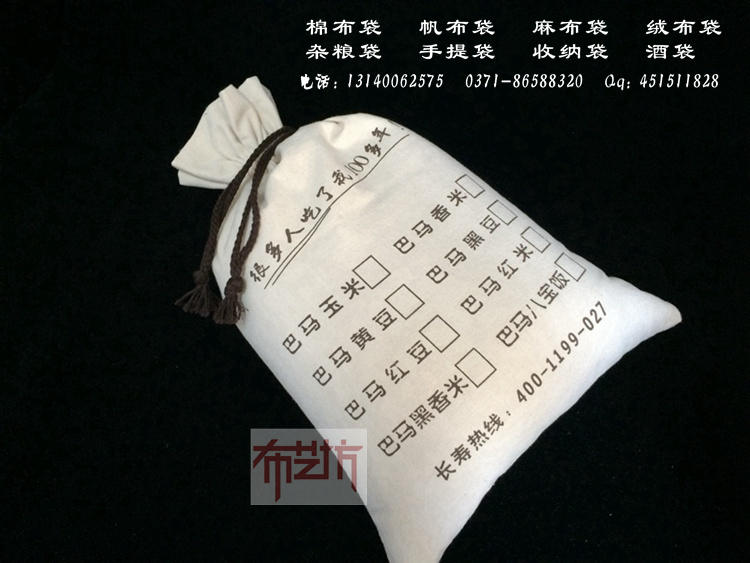 阳泉市棉布杂粮袋大米袋定做厂家 优质帆布袋小米袋定制,五谷杂粮是人们日常生活中重要的也是必不可少的食物,合理的摄入五谷杂粮可以充分调节我们身体,补充我们身体中所必不可少的各种营养成分,调节身体状态,让我们的身体状态充分得到改善, 五谷不仅好吃,而且有很特别的做法,是各类美食爱好者必要研究的课题。五谷如此热销,行业竞争日益激烈,如何让自己产品处于显眼的位置,让自己产品成为行业的领导者,是一个非常非常重要的问题 面对这样的问题我们到底该如何的去应对,这时候您就需要郑州布艺坊的帮助了,我们可以根据您的需求为您提供合适的方案,帮助您的企业产品做更好的宣传,本公司专业定制束口杂粮袋,所有杂粮袋 均选用上好的帆布,根据公司性质,产品特色,专业设计,让您的产品极具特色很快的在同行业中脱颖而出,如今的市场首先您要满足的客户的眼睛对美的、对新奇事物的好奇,只有外表吸引住了客户,客 户才会有心思花时间去了解我们的产品,客户愿意去花时间了解我们的产品,我们的销售就已经成功了一大半,请相信郑州布艺坊的专业也,我们从事布袋定做,杂粮袋加工也是多年,从工作中也总结了无 数的经验,足以应对我们生产过程中所能遇到的大部分问题,我们会用专业的服务去回报我们的客户,欢迎参观郑州布艺坊。