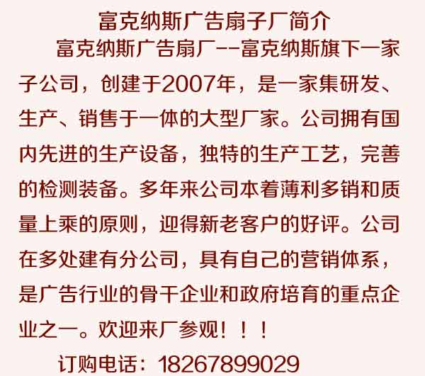 (一)【江苏檀香扇】 檀香扇是用檀香木制成,其木质坚硬。白者白檀,皮腐色紫者紫檀,白檀为胜。有天然香味,轻轻摇,馨香四溢。此扇有“扇存香存”的特点,保存十年八载后,扇起来依然幽香阵阵,沁人心脾。夏令既去,藏入衣箱,还有防虫、防蛀的妙用。花式品种有拉花、烫花、雕花、绘画、印花、镶嵌和接骨等。一般经锯片、组装、锼拉、裱画、绘画和上流苏等十多道工序组成。 檀香扇以其独特技艺,独具风格,富有工艺性,而至今深受人们的喜爱。 陕西西安pp塑料广告胶扇厂家制作