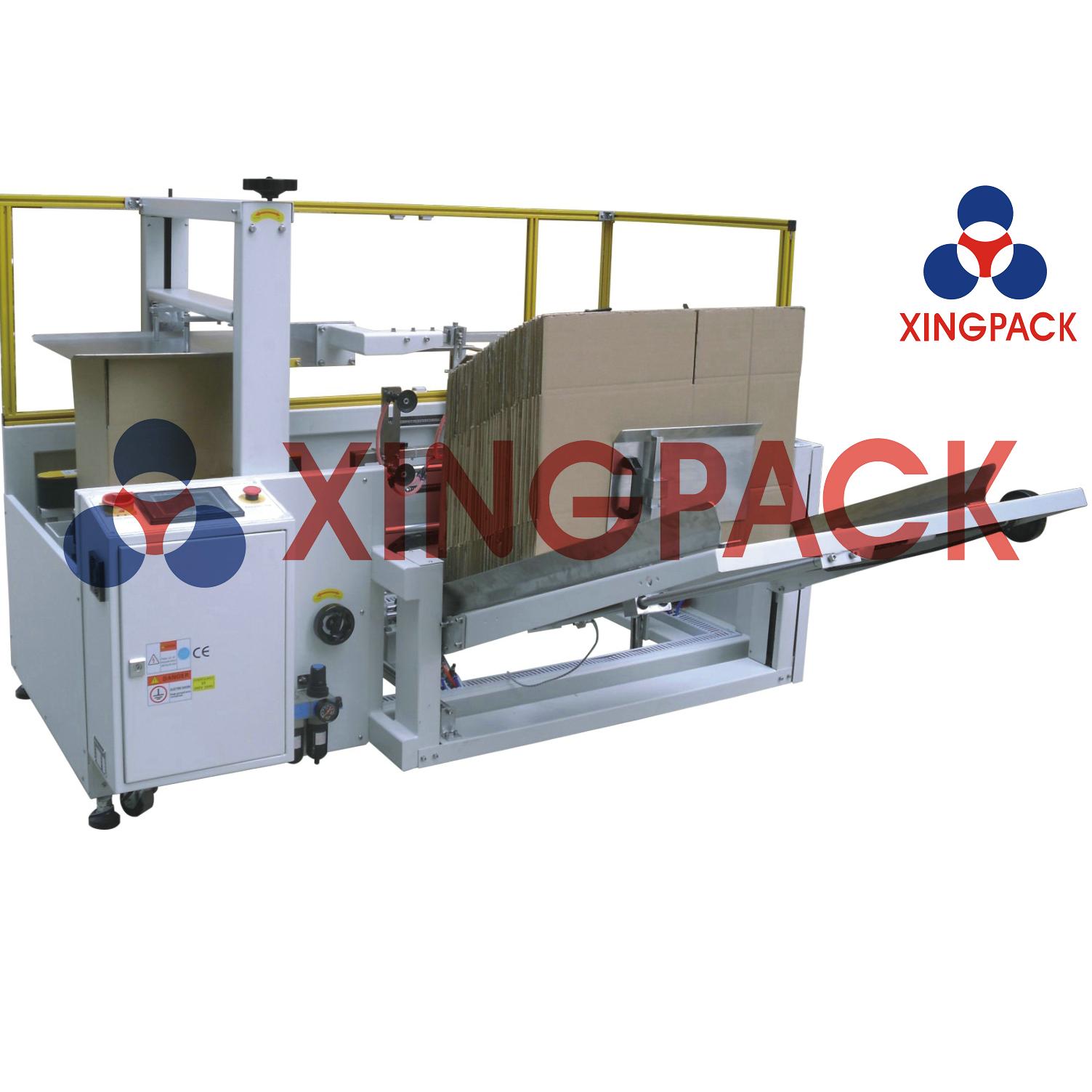 上海星派科技有限公司全自动开箱机可根据客户的需求,配置适宜相应生产流水线的机器颜色;体积轻巧,滑轮相辅,位移灵活,更加方便安装与调试;采用立式储存纸板方式,并可随时补充纸箱板,不需停机,更多的时间,更多的包装;此开箱机结构设计:一次完成纸箱吸箱、开箱、成型、折底、封底等包装工序。适用于多种尺寸的纸箱自动开箱封底,如需变换纸箱规格,手动调节即可,所需时间1-2分钟,开箱机可单机作业,也可与自动化包装流水线配套使用;本开箱机性能稳定、品质可靠、适用性强、包装效率高、使用寿命长;自动化程度高:自动开箱、自动折合下盖、自动密封下底胶带。机件性能精密耐用,结构设计严密,运转过程无振动,运转稳定可靠;配装刀片防护装置,避免操作时意外刺伤,安全的生产,高效的包装。依托以上的优势,纸箱自动成型封底机KX-01已广泛地应用于食品、饮料、日化、玩具、电子等国内外各行业。