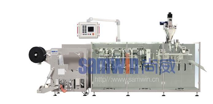 整机工序包括:自动上料—自动制袋--自动打印三期(色带打印)--撕口工位--自动开袋(辅助开袋)—自动灌装(除尘)—抹袋除尘—自动封口—自动整形—自动落袋(机械手)---自动检重(选配)