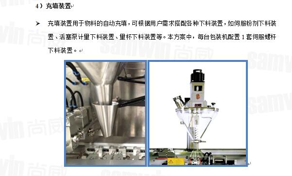 定量包装机的充填装置用于物料的自动充填,可根据用户需求搭配各种下料装置,如伺服粉剂下料装置、活塞泵计量下料装置、量杯下料装置等。