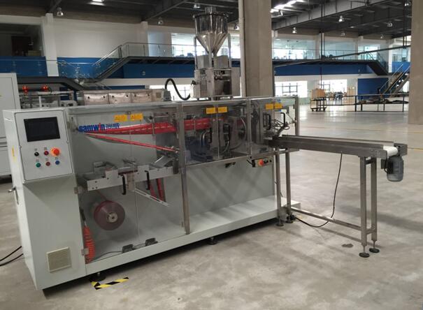 水平预制袋包装机,通过选用本公司生产的充填装置配套产品(俗称充填机),如伺服粉剂充填装置、双螺杆粉剂下料装置、胶体泵充填装置、磁力泵充填装置、抽屉式颗粒下料装置及相应的螺杆上料装置或真空上料装置等,可以包装不同性状的物料,如粉状、颗粒状、膏体状和液体等。