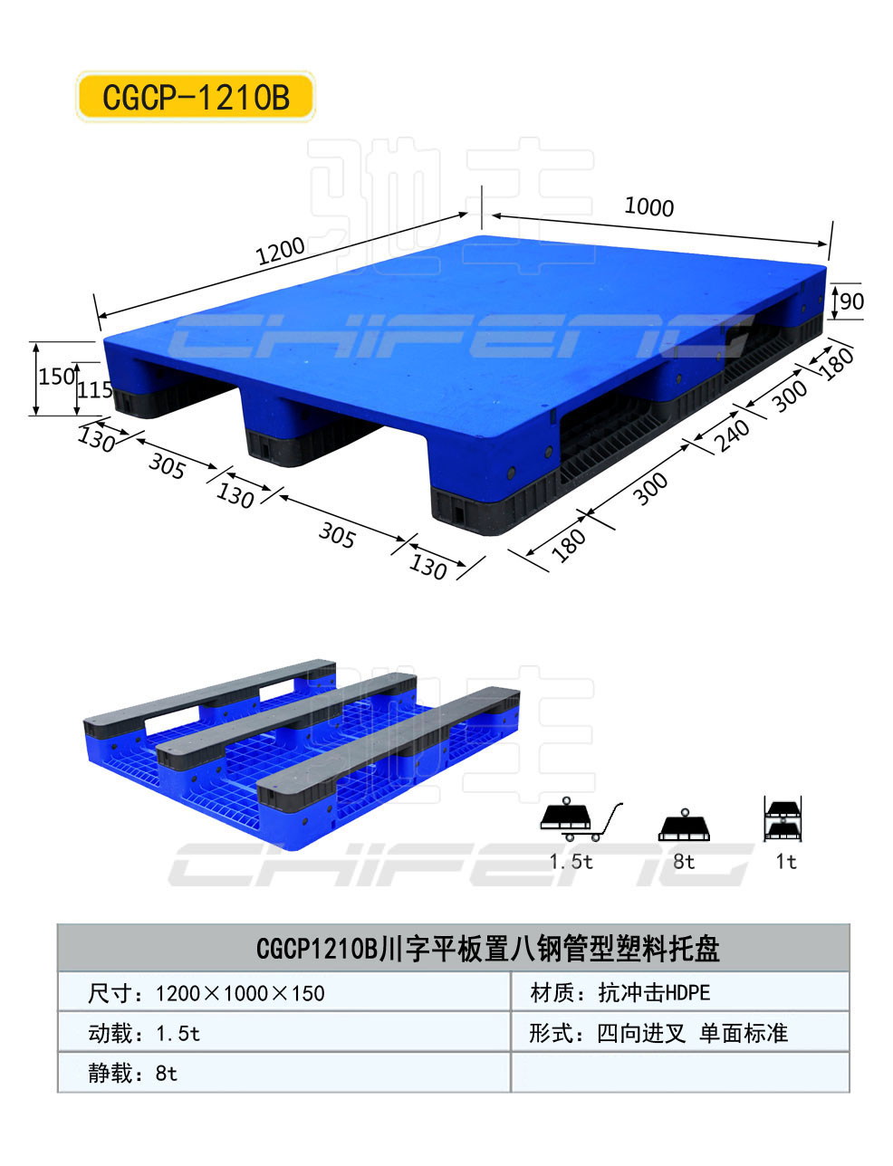 1、双面使用型塑料托盘 平板双面型塑料托盘(只能用于机械叉车四向使用) 网格双面型塑料托盘(只能用于机械叉车四向使用) 2、单面使用型塑料托盘 平板九脚型塑料托盘;网格九脚型塑料托盘(机械或者手动都可以四向使用) 平板田字型塑料托盘;网格田字型塑料托盘(只能用于机械叉车四向使用) 平板川字型塑料托盘;网格川字型塑料托盘(机械叉车四向使用,手动叉车双向使用) 能否机械手动叉车通用主要应当看托盘底部的结构,例如双面或者田字托盘由于底部有横梁或者为平板,导致手动叉车无法进入,即使进入由于是叉在托盘中间导致无法使用,所以消费者在采购塑料托盘时候一定要根据自己的实际使用情况进行选择,以免买到一个不适合自己的托盘产品。 您可以通过底部的参考资料看下具体原因,有各种托盘的底部结构照片,图文并貌一看就可以根据自己的叉车选择配套的托盘产品。