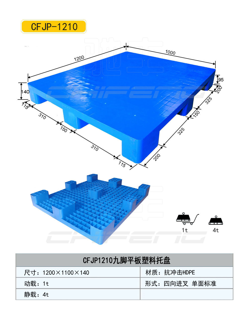公司生产塑料托盘的主要原料是一些高强度原料(HDPE)。其性能强度高。承受力大,使用寿命长。 本产品采用全新(聚乙烯)生产成型。规格如下:1200*1000*145mm (标准型) 1200*800*180mm (标准型) 1200*1000*150mm (田字型) 1200*1000*150mm(双面网格)1000*598*48mm 900*300*30mm 1200*1000*150mm(川字型) 1100*1100*150mm(田字型) 1100*900*150mm(标准型) 1100*1100*145mm (单面四面进插) 1200*800*142mm (单面网格) 1000*1000*145mm(网格单面) 1200*1000*145mm(网格九角) 1200*1000*170mm(网格川字型) 1200*1200*150mm(网格田字型)