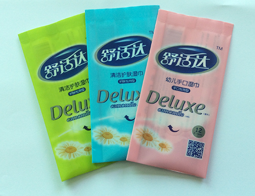 2复合湿巾包装袋与三复合湿巾包装袋。2复合湿巾包装袋一般材料为PET与PE或者OPP与PE,3复合湿巾包装袋在2复合的基础上再复合一层,更加牢固。一般3复合湿巾袋材料为OPP与镀铝与PE,镀铝有一定的遮光性。