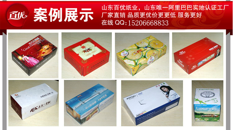 山东百优纸业 盒抽纸(http://www.baixingzhiye.com/)本站声明:本公司专业定做广告盒抽纸,广告抽纸,广告钱夹纸,ktv盒抽纸,汽车4s店盒抽纸,酒店餐巾纸等,山东商务用纸高端定制第一品牌厂家,欢迎广大客户前来洽谈。定制热线:15206668833
