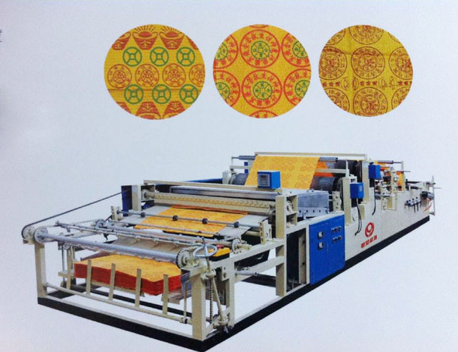 烧纸双印压印机是一台特别设计机型,机器自动上纸,大轴两层同步运行、印刷、加湿加胶后压印增加纸张挺度,烘干、自动切纸计数、自动接纸双层纸产量高、速度快。