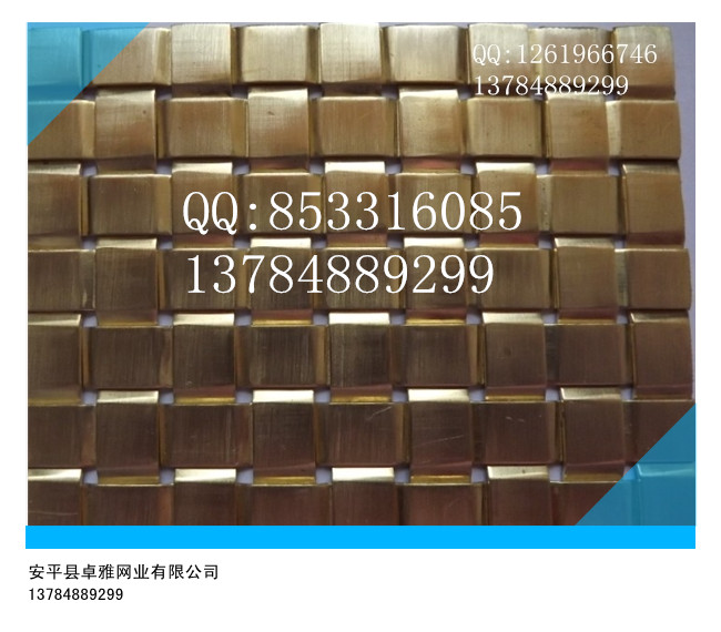 装饰用铜网可用做墙面装饰,隔断丝网,屏风装饰,卓雅金属网通过对金属丝或金属直条的轧弯或轧扁等处理,加工成独特的花型和纹路,其特点是耐磨损,防潮湿,易清洗,防水防火,外观精致,档次高。 有平面式,弧形挂法式,特殊造型式:金属编织网视觉通透,开阔,节省空间,装配简单方便,它比其他材料具有更多的使用功能、更多的装饰效果。 卓雅金属装饰网其独有的材质结构完全符合环保、消防的要求,而且并可对屋顶设施起到承托保护的作用,防止屋顶设施,墙体的意外脱落;其特有的装饰艺术效果,看上去美轮美奂;同时,由于其天然的不锈钢色泽,在灯光映射下,产生纷繁幻妙的视觉效果,似银光闪闪的碧波,轻轻荡漾。