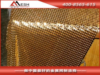 丝美艺金属布是祥益装饰网产品中的软装系列,是由多个铝网片片结合而成,英文称为metalmesh;金属布是一个个单独的铝片,从侧边叠成包馅形状,然后中间用铝丝穿起来,正面看起来像是竹席一样整齐划一,背面则是盘根错节的样子。铝网片有极强的装饰效果,金属质感的鳞片可以像布一样可以随意变动,在光影变幻之下,显出迷人的斑斓色彩。