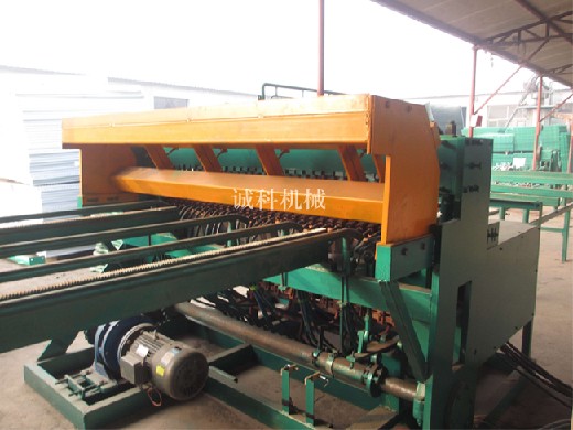 新型钢筋网焊机焊接电流采用微 机同步控制,每一台焊接变压器的焊接电流和时间均可单独调节,机器操作界面采用彩色触摸屏和控制按钮,操作便捷、简单。新型钢筋网焊机主机为框架结构,性 能稳定,焊接压力连续可调,焊点牢固,美观。新型钢筋网焊机动力为一体式减速电磁制动电机,采用变频器控制,速度可调,上下电极模块化设计,网孔调整方便 快捷,横丝料斗为步进电机驱动盘式装置取丝,电动磁性增料装置从大料仓自动将横丝送入盘式装置准备区,横丝料斗安装在可移动拉网架上,方便调整和维护,拉 网部分采用伺服电机驱动,可在同一网片上设置多种横丝间距,连续往复拉网,实现加长尺寸网片,采用气动夹紧装置,使横丝间距准确,纵线送料部分采用步进电 机驱动送丝小车,可在网片焊接同时,放置下一张网片的纵丝,使机器工作间隔时间很短。新型钢筋网焊机配有网片托辊架和可移动纵丝托架。
