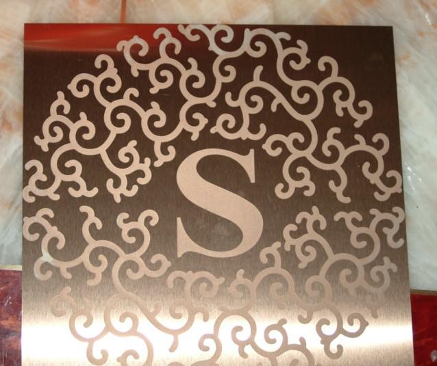 不锈钢蚀刻板是在不锈钢表面通过化学的方法,(13825594913霍先生)腐蚀出各种花纹图案。以8K镜面板、拉丝板、喷砂板为底板,进行蚀刻处理后,对物体表面再进行深加工,不锈钢蚀刻板可进行局部的和纹,拉丝,嵌金,局部钛金等各式复杂工艺处理,不锈钢蚀刻板实现图案明暗相间,色彩绚丽的效果。