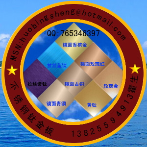 真空电镀彩色不锈钢板:(13825594913霍先生)彩色不锈钢通过化学(或电化学)处理,在不锈钢表面形成一层高抗蚀性氧化膜,给不锈钢着上不同色彩,不仅使其保持了不锈钢原有的各种优越性,而且使其耐蚀性能、耐老化性能、耐紫外线照射性能和外观装饰效果优于普通不锈钢。其颜色有浅金黄色,金黄色,紫红色、宝石蓝,黑钛,钛金、咖啡色,幼彩色,锆金色,青铜色,玫瑰色,香槟色;古铜色等.