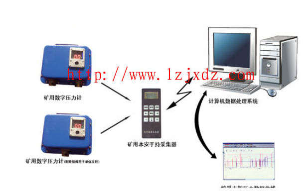 综采支架工作阻力检测采集系统由YHY60矿用数字压力计、矿用本安手持采集器、计算机数据处理系统三部分组成,采用红外方式传输。 压力计具有两个压力测孔,测量通道数 2点,可同时测量两个测点的压力,并连续记录在压力计内,一个工作面可布置1—16个分机,可使用一台采集器进行采集,采集器携带至井上后通过串口将数据自动地传送到PC计算机处理。压力计可现场通过按键唤醒,同时可增光照唤醒功能,唤醒后显示当前采集压力。