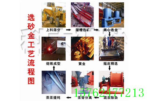 淘沙金的流程一般为筛分,洗选,精选,混汞,但根据具体情况又需要其他辅助流程,如含泥量较大的沙金矿需要增加洗矿流程,避免泥质包裹金造成流失,含量极低的沙金矿预选经过选矿溜槽富集,然后进入粗选流程,含量高且有大颗粒金存在的沙金矿还需在滚筒筛粗砂段添置检查溜槽,避免粗粒金的流失。