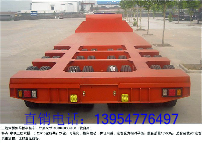 出口重型低平板半挂车,重型低平板半挂车价格,重型低平板挂车厂,重型低平板半挂车用于装载超大型和超重货件的挂车。重型挂车的基本形式为单体平板挂车。它一般有下列结构。车架和轮轴 轮轴多为两轴共线,即在一根轴线上有左右两根轮轴,也称作两轴列。常见的单体平板挂车有2~7轴线。一根轮轴装4只轮胎,一道轴线就有8只轮胎。所以全车的宽度可达 3米以上。为了降低整车重心,一般装用直径小而载重能力大的钢丝子午线宽轮辋轮胎(见汽车轮胎),每只轮胎在低速运行条件下可承受4吨左右的载荷。车架采用高强度合金钢箱形截面的焊接结构。通常一辆 5轴线、两轴列的单体平板挂车可以载重百吨以上。中国重型汽车集团梁山四通专用汽车有限公司生产和出口各种重型低平板半挂车,国内知名品牌,质量保证!欢迎各地新老用户来人来电 ,欢迎前来洽谈.