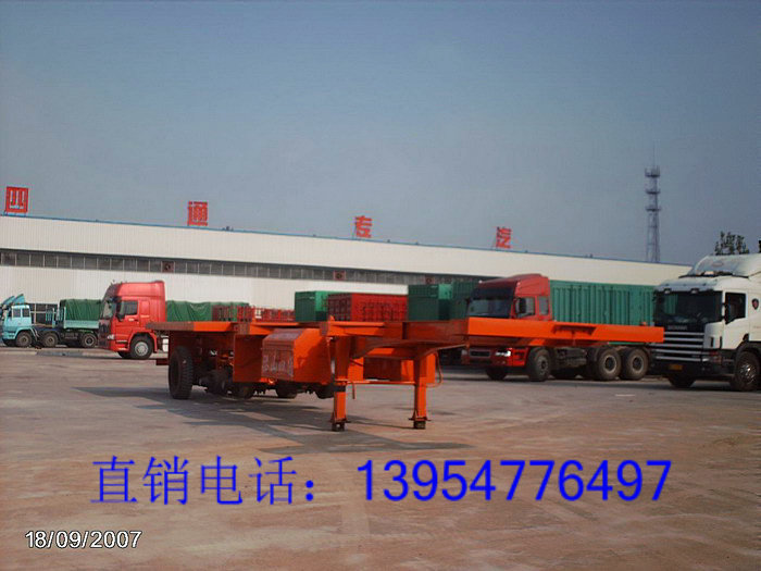 出口集装箱骨架半挂车,集装箱骨架半挂车厂家,骨架半挂车价格,集装箱骨架运输车是集装箱运输半挂车车架的一种还有一种是平板式。骨架式车驾由纵梁、横梁和前、后端梁焊接而成,纵梁采用优质钢板16Mn埋弧焊接成工字形(主要尺寸有450、500),横梁采用优质钢板冲压成槽型,前后端梁为焊接式矩形截面。中间集装箱锁紧装置部位设置了整体式长横梁,以提高集装箱锁紧装置的承载能力。平板式与骨架式的区别在于平板式增设了边框和花纹地板。木系列集装箱运输半挂车的车架全部喷丸处理,整个车架是在专用的定位台架上组装、焊接而成,其结构合理、强度高、外形美观。在车架上设置了集装箱紧缩装置,可以装载40英尺、20英尺两种标准集装箱。前后端的四个集装箱紧缩装置为固定式结构,中间集装箱紧缩装置为可藏式结构。装载集装箱时,根据需要可将中间集装箱锁紧装置降低到货台平面以下。选用机械式承载装置,主要有宝华12T、20T;富华13T;JOST;等类型。其作用是当牵引装置与挂车脱开时,用于支撑地面,承受半挂车前部载荷。支承装置有单动式和联动式两种,主要由支承盘、螺杆传动机构、减速箱和操纵手柄等构成。悬挂装置有单轴式悬挂和双轴式悬挂三轴式悬挂三种装置半挂车配备两付备胎架,分别安装在挂车车架左、右两侧,并备有备胎升降器。中国重型汽车集团梁山四通专用汽车有限公司生产和出口各种骨架式集装箱半挂车,国内知名品牌,质量保证!欢迎各地新老用户来人来电 ,欢迎前来洽谈.欢迎各地新老用户来人来电 ,欢迎前来洽谈.